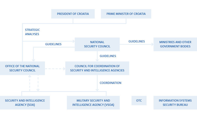 The work of security intelligence agencies is guided by the Croatian president and the Government through the National Security Council (VNS).